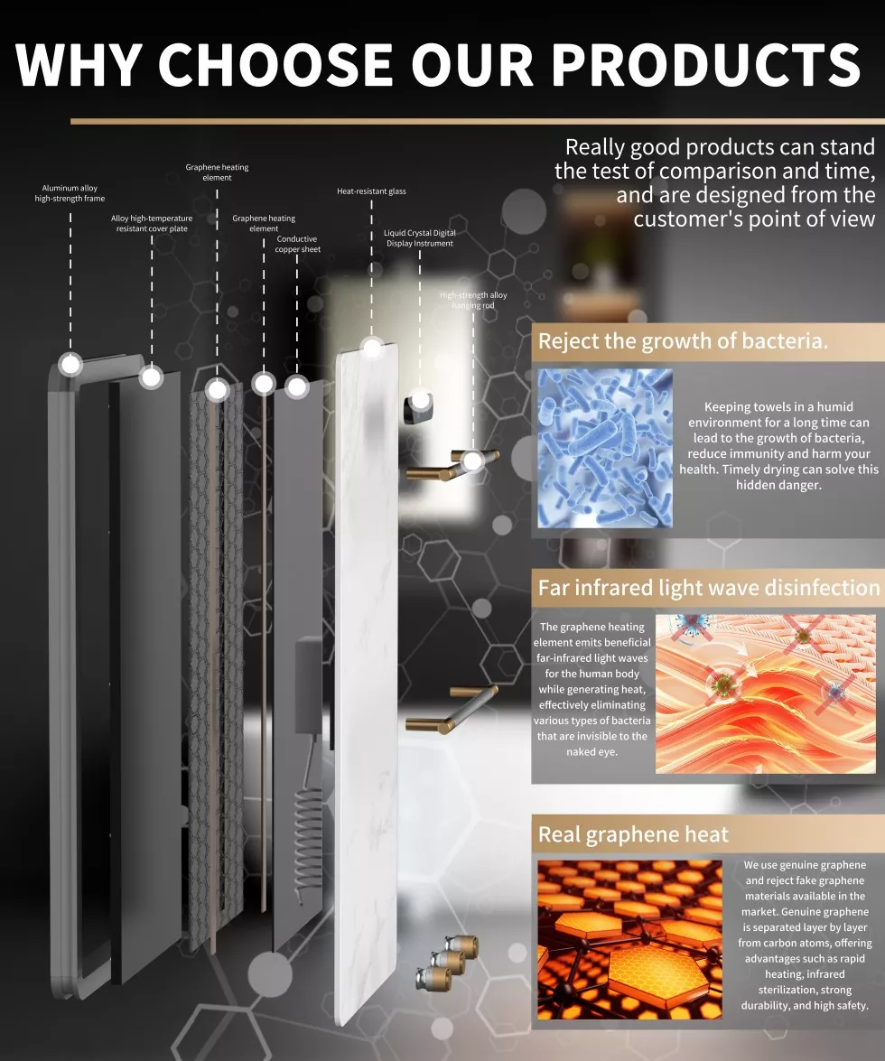 Výrobca Meshow chápe dôležitosť spotrebiteľov, ktorí sledujú kvalitný život, a je odhodlaný integrovať najnovšie technologické úspechy do denných výrobkov. Tento koncept predstavil stojan na biely uterák Graphene Smart Glass, ktorý predstavuje tento koncept. Má nielen vynikajúci vykurovací výkon, ale má tiež zdravé a environmentálne vlastnosti. Pomocou grafénovej technológie efektívne zabíja baktérie a odvlhčuje sa, čím udržiava čerstvý vzduch v interiéri.